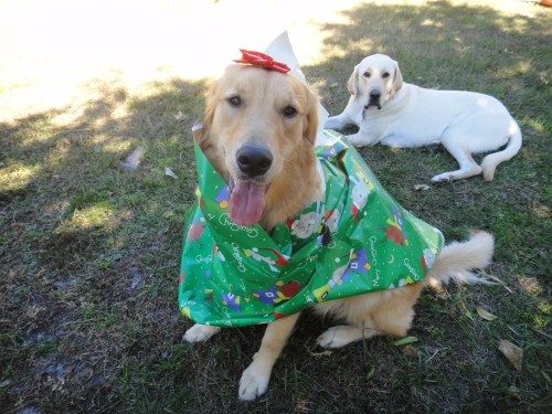 I rescued and adopted Seamus Finbar in May of 2010 when he was 5 months old. He was a puppy mill Golden who was confiscated from his owner along with several other puppies all kept in crates on her porch. He was 10 lbs. underweight and had untreated demodectic mange. At that point he had been transferred around to 5 different homes since his birth. Despite all that he is an incredibly happy and now healthy boy who is still very much a puppy. His older brother, Austin, would like him to be someone else’s Christmas present, LOL. But they do love each other.